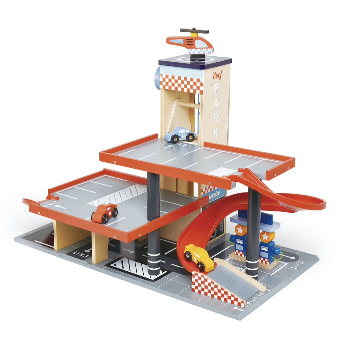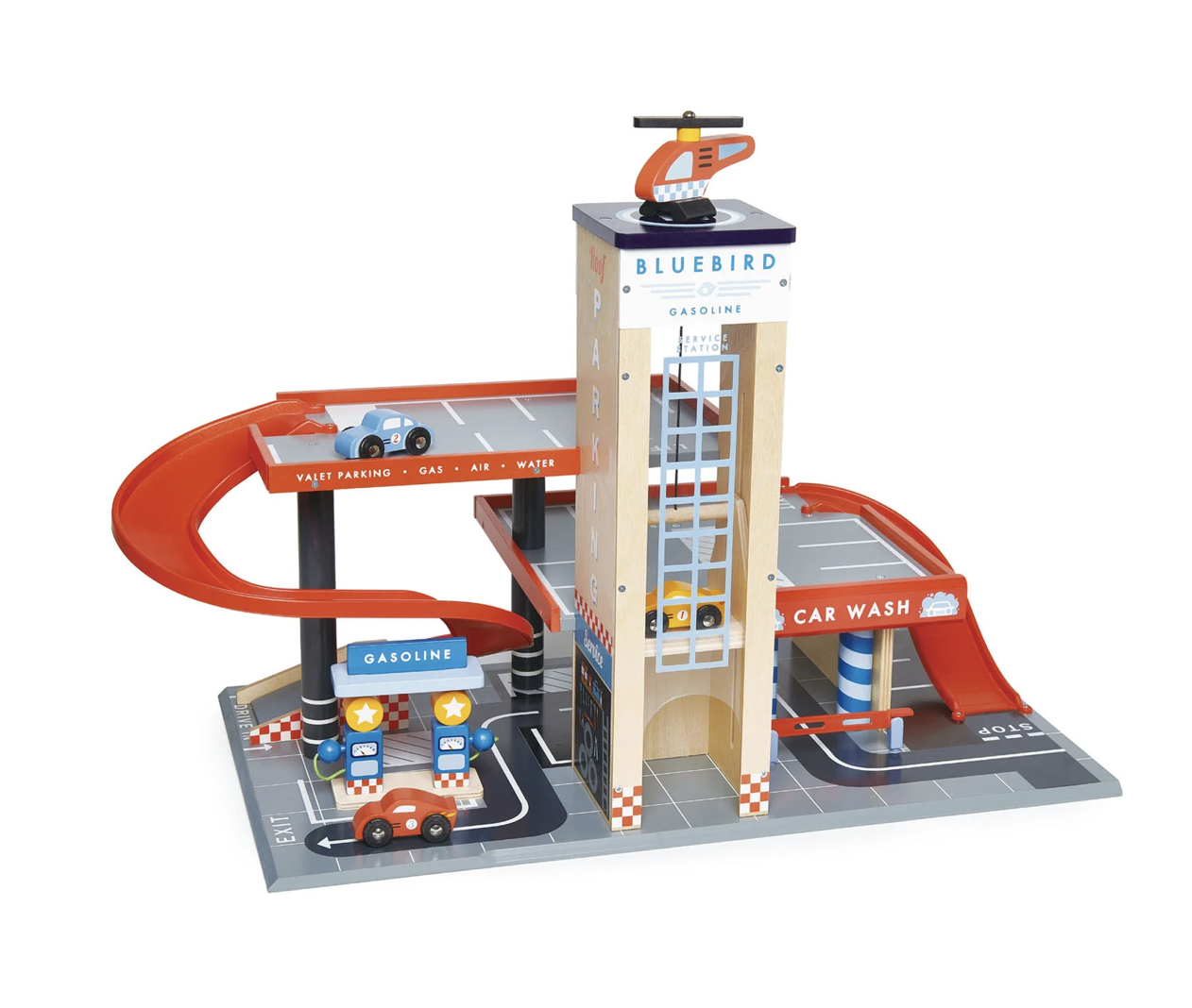 This magnificent Bluebird garage and service station with its unique clear acrylic central panel has lots of play from all sides. It has 2 ramps, a manual and moving lift for the 3 included wooden cars, a carwash area with rotating columns and a lever to grant access a helipad with an included helicopter, 2 small petrol pumps, and loads of marked parking bays to park your cars.