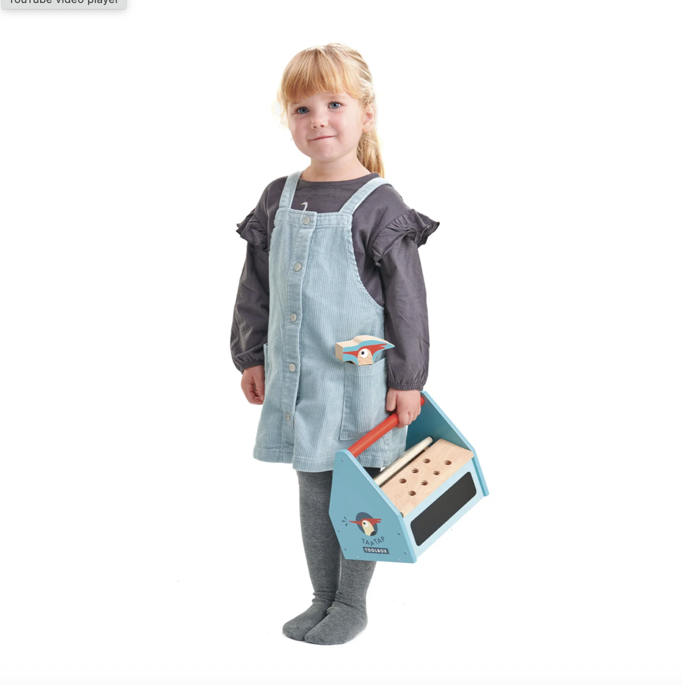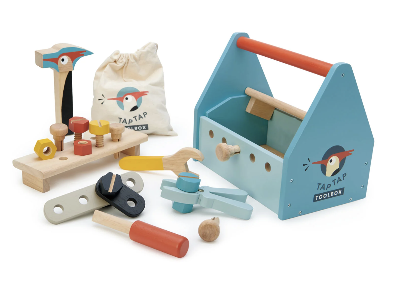 A Tender Leaf Toys branded woodpecker themed tool box filled with everything you need to build something on your own. With two removable lid pieces that turn into screwable plates, and a cloth printed bag to pack away after play, this set includes a woodpecker hammer, a pair of pliers, a screwdriver, a spanner, 2 screws, 2 bolts, 2 planks, 4 nuts, and 4 pegs. We have even included a chalkboard on one end of the box to record your inventions.